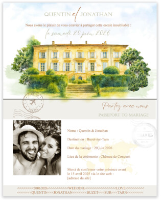 Découvrez notre faire-part Passeport, une création élégante et entièrement personnalisée, idéale pour annoncer votre mariage, un brunch ou un événement plein d’évasion.